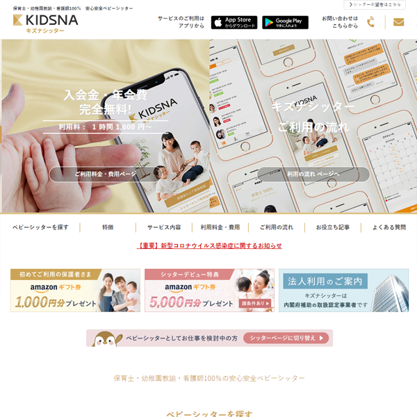 業界初!保育士資格、幼稚園教諭免許、看護師免許の国家資格保有者のみが登録しているシッターサービス